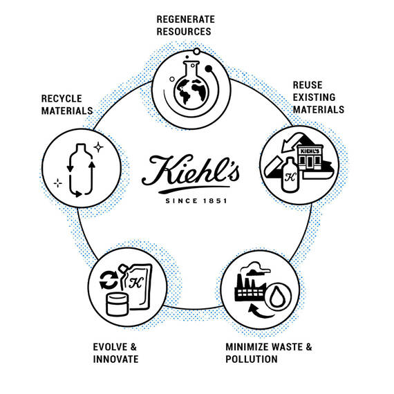 Kiehl’s thực hiện theo 1 vòng tuần hoàn bằng việc tập trung vào cách sử dụng tài nguyên và quá trình sản xuất sản phẩm, đồng thời Kiehl’s còn có kế hoạch tái chế nguyên liệu sau khi sử dụng nhằm giảm thiểu việc tạo chất thải ra môi trường.
