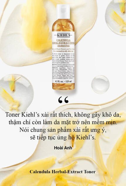 Là sản phẩm bán chạy nhất được khách hàng của Kiehl’s ưa chuộng từ những năm 1960, toner hoa cúc Kiehl's Calendula Herbal Extract Alcohol-Free không chứa cồn đình đám được điều chế với chiết xuất từ cánh Hoa Cúc, chứa năm hợp chất làm dịu da giúp giảm các dấu hiệu căng thẳng trên da bao gồm mẩn đỏ, tiết nhiều dầu thừa và trở nên nhạy cảm. Công thức dịu nhẹ của Toner Hoa Cúc lý tưởng cho da thường, da khô, da dầu và cả da nhạy cảm, mang lại làn da đều màu và cảm giác dịu nhẹ, sảng khoái khi sử dụng.